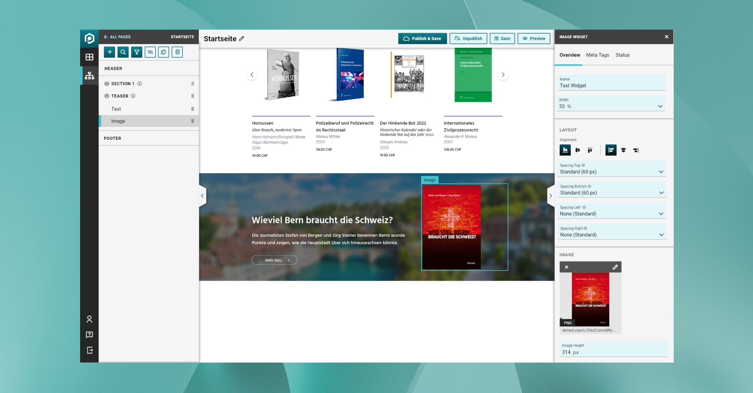 Im Content Management System galt es, den Spagat zwischen Bearbeitungs- und Vorschau-Modus zu schaffen. Die Nutzer:innen sollten die erstellten Seiten in einer realitätsnahen Vorschau sehen („What you see is what you get“) und gleichzeitig umfangreiche Anpassungsmöglichkeiten haben, ohne das konsistente Design zu gefährden.